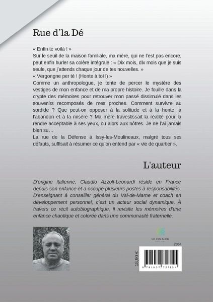 « Enfin te voilà ! » Sur le seuil de la maison familiale, ma mère, qui ne l'est pas encore, peut enfin hurler sa colère intégrale : « Dix mois, dix mois que je suis seule, que j'attends chaque jour de tes nouvelles. » « Vergongne per té ! (Honte à toi !) » Comme un anthropologue, je tente de percer le mystère des vestiges de mon enfance et de ma propre histoire. Je fouille dans la crypte des mémoires pour retrouver mon passé dissimulé dans les souvenirs recomposés de mes proches. Comment survivre au sordide ? Que peut-on opposer à la solitude et à la honte, à l'abandon et à la misère ? Ma mère travestissait la réalité pour la rendre acceptable à ses yeux, ou alors aux nôtres. Je ne l'ai jamais bien su... La rue de la Défense à Issy-les-Moulineaux, malgré tous ses défauts, suffisait à résumer ce qu'on entend par « vie de quartier ».