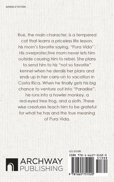 Rue is a loving cat-but he's tough, too. He gets annoyed that his overprotective mom never lets him go outside, so he rebels. Even when he's been bad, though, his human still loves him. Even so, she does take a break from Rue every couple months to go on vacation to Costa Rica. His mom has a thing for traveling, and he wishes she would take him with her. How can Rue ever find true happiness in life always cooped up inside? His mom's favorite saying is "Pura Vida." In Costa Rica, it means "pure life" or "simple life." There is nothing simple about Rue having to go to the hated kennel, so when he derails Mom's plans, he ends up in her vacation carry-on. Rue finally gets to travel! When he gets his big chance to venture out into "Paradise," he runs into a howler monkey, a green-eyed tree frog, and a sloth. These wise creatures teach him to be grateful for what he has and the true meaning of "Pura Vida." Rue's amazing adventure shows him how to live a simple, pure, and joyful life-not just in Costa Rica but at home with his mom too.