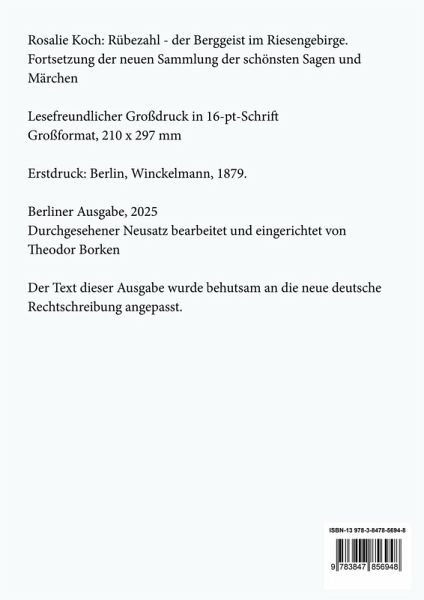 Rosalie Koch: Rübezahl - der Berggeist im Riesengebirge. Fortsetzung der neuen Sammlung der schönsten Sagen und Märchen Lesefreundlicher Großdruck in 16-pt-Schrift Großformat, 210 x 297 mm Berliner Ausgabe, 2025 Durchgesehener Neusatz bearbeitet und eingerichtet von Theodor Borken Erstdruck: Berlin, Winckelmann, 1879. Der Text dieser Ausgabe wurde behutsam an die neue deutsche Rechtschreibung angepasst. Gesetzt aus der Minion Pro, 16 pt. Henricus - Edition Deutsche Klassik GmbH