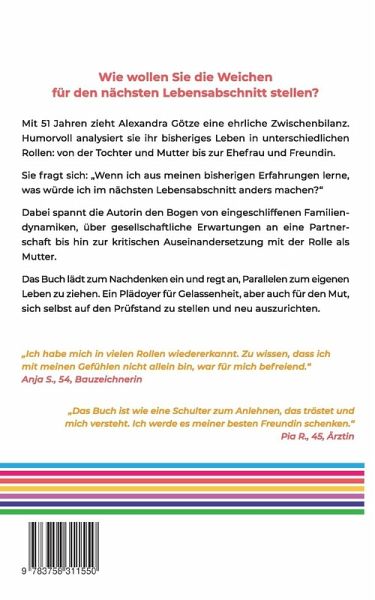 Alexandra Götze zieht in ihren Buch eine ehrliche und humorvolle Zwischenbilanz. Anlass ist ihr 50. Geburtstag, der für die Autorin eine Zäsur der besten Art und Weise markiert. Eine Gelegenheit zur tiefen Selbstreflexion und Neuausrichtung. Sie stellt sich die Frage: Wie kann sie ihre bisherigen Erfahrungen nutzen, um den kommenden Lebensabschnitt bewusster und gelassener zu gestalten? In einem Blick zurück betrachtet Götze ihre verschiedenen Rollen als Tochter, Schwester, Freundin, Ehefrau, Mutter, Berufstätige und ihr eigenes Selbst.Die Leserinnen begleiten Götze auf eine humorvolle Reise der Selbstreflexion. Sie spannt den Bogen von eingeschliffenen Familiendynamiken, gesellschaftlichen Erwartungen an Partnerschaft bis zur kritischen Auseinandersetzung mit sich selbst. Schonungslos ehrlich schildert sie die Herausforderungen der jeweiligen Rolle und stellt am Ende eines jeden Kapitels Fragen, die die Leserin zur Reflexion über ihr eigenes Leben einladen.In Alexandra Götzes Buch geht es um nichts weniger, als sich selbst und die eigene Ausrichtung auf den Prüfstand zu stellen. Die Autorin plädiert dafür, dass Frauen aktiv und selbst bestimmt ihren Lebensentwurf gestalten, anstatt sich in festgefahrenen Rollen zu verlieren.Eine Lektüre, die ermutigt, die kommenden Jahre mit Zuversicht und Gelassenheit zu begrüßen.