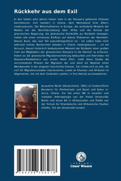In den letzten zehn Jahren haben viele in der Diaspora geborene Ghanaer beschlossen, sich (wieder) in Ghana, dem Heimatland ihrer Eltern, niederzulassen. Die Wirtschaftskrise in Europa, die veränderte Rhetorik der Medien bei der Berichterstattung über Afrika und die Anreize der ghanaischen Regierung, die ghanaische Fachkräfte zur Rückkehr bewegen, hatten alle einen immensen Einfluss auf dieses Phänomen der Heimkehr. Dieses Buch, das zum Teil auto-ethnografisch ist - ich selbst habe mich während meiner Recherchen (wieder) in Ghana niedergelassen -, ist ein Versuch, diesen historisch bedeutsamen Moment der Rückkehr einer großen Zahl von Mitgliedern der ghanaischen Diaspora in die Heimat" zu erfassen. Indem es die ghanaische Migrationserfahrung beleuchtet und Interviews mit Diaspora-Rückkehrern aus erster Hand führt, stellt diese Studie die verschiedenen Phasen der Migration dar und dient als Register eines Wendepunkts in der jüngsten Geschichte Ghanas. Sie richtet sich an alle, diesich für Migrationsstudien interessieren, sowie an Ghanaer und Afrikaner im Allgemeinen, die mit dem Gedanken spielen, in ihre Heimat zurückzukehren.