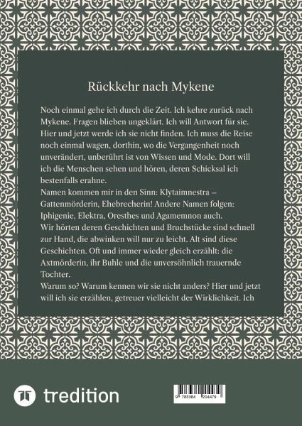 Noch einmal gehe ich durch die Zeit. Ich kehre zurück nach Mykene. Fragen blieben ungeklärt. Ich will Antwort für sie.Hier und jetzt werde ich sie nicht finden. Ich muss die Reise noch einmal wagen, dorthin, wo die Vergangenheit noch unverändert, unberührt ist von Wissen und Mode.Dort will ich die Menschen sehen und hören, deren Schicksal ich bestenfalls erahne.Namen kommen mir in den Sinn: Klytaimnestra - Gattenmörderin, Ehebrecherin! Andere Namen folgen: Iphigenie, Elektra, Oresthes und Agamemnon auch.Wir hörten deren Geschichten und Bruchstücke sind schnell zur Hand, die abwinken will nur zu leicht. Alt sind diese Geschichten. Oft und immer wieder gleich erzählt: die Axtmörderin, ihr Buhle und die unversöhnlich trauernde Tochter.Warum so? Warum kennen wir sie nicht anders? Hier und jetzt will ich sie erzählen, getreuer vielleicht der Wirklichkeit. Ich kann es nicht wissen. Ich muss es hoffen.Auszug aus: "Klytaimnestra""Nicht ohne Überlegung handelte ich und nicht ohne Abwägen.Was Iphigenie weckte in mir und er mir androhte dafür, zwang mich zur Entscheidung. Was ich für mich erkämpfte, nicht ohne Widerstand, das galt es zu schützen.Ich nahm den Kindern den Vater, das ist wahr. Aber was war er für ein Vater? Was war Agamemnon für ein Mann und was war er mir für ein Gemahl? Niemand mehr fragt danach. Nicht einer will noch wissen, was und wie er war in Wahrheit. Mein Opfer haben sie aus ihm gemacht und wenn es auch wahr ist, bleibt es nur ein Teil der Wahrheit. Niemand, scheint es, will noch wissen, wie er uns und Mykene beherrschte.Blinde Wut und grundlosen Hass hat man mir später zugedichtet. Seinen Teil verschweigt die Zeit. Bestenfalls eine trauernde Mutter gestattet sie mir zu sein, die ihr Kind rächte. Halbe Wahrheiten sind auch halbe Lügen.Nichts Schlechtes soll man sagen über Tote. Nicht nachreden, denen, die nicht mehr Antwort stehen können. Die ins Reich der Schatten reisten, sollen sicher sein, vor übler Rede für immer. Was ist aber mit mir? Wann habe ich dieses Recht verloren?"