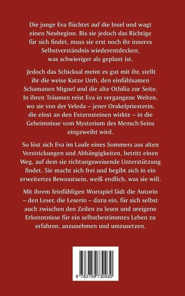 Die junge Eva flüchtet auf die Insel und wagt einen Neubeginn. Bis sie jedoch das Richtige für sich findet, muss sie erst noch ihr inneres Selbstverständnis wiederentdecken, was schwieriger als geplant ist. Jedoch das Schicksal meint es gut mit ihr, stellt ihr die weise Katze Urrh, den einfühlsamen Schamanen Miguel und die alte Othilia zur Seite. In ihren Träumen reist Eva in vergangene Welten, wo sie von der Veleda - jener Orakelpriesterin, die einst an den Externsteinen wirkte - in die Geheimnisse vom Mysterium des Mensch-Seins eingeweiht wird.So löst sich Eva im Laufe eines Sommers aus alten Verstrickungen und Abhängigkeiten, betritt einen Weg, auf dem sie richtungsweisende Unterstützung findet. Sie macht sich frei und begibt sich in ein erweitertes Bewusstsein, weiß endlich, was sie will. Mit ihrem feinfühligen Wortspiel lädt die Autorin - den Leser, die Leserin - dazu ein, für sich selbst auch zwischen den Zeilen zu lesen und ureigene Erkenntnisse für ein selbstbestimmtes Leben zu erfahren, anzunehmen und umzusetzen.