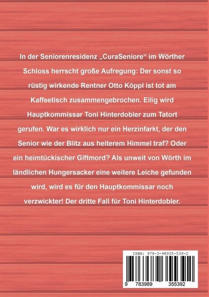 "Rüscherltod. Mord im Wörther Schloss", ein Provinzkrimi aus Bayern Ein Rüscherl, eine Wildsau und zwei Tote¿ Der dritte Fall für Hauptkommissar Toni Hinterdobler. Kurzbeschreibung: Berta und Fanny, zwei befreundete Bewohnerinnen der noblen Seniorenresidenz im Wörther Schloss, treffen sich jeden Mittwochnachmittag Punkt fünfzehn Uhr mit Otto, einem rüstigen Rentner und ebenfalls Bewohner des Heims, zum Kaffeeklatsch. Diesmal aber bricht Otto tot am Tisch zusammen. Ein Herzinfarkt? Oder wurde er absichtlich um die Ecke gebracht? Was aber hat Hinterdoblers Tante und ein Wildschwein mit der ganzen Sache zu tun, und warum wird der Hauptkommissar an Orten gesehen, an denen er nicht war? Zu allem Überfluss ist er auch gleich zweimal auf dem ¿Holzweg¿, was ihm jedoch erst später bewusst wird¿ Dass darüber hinaus aber seine elfjährige Tochter schon eifrig auf Instagram unterwegs ist, macht ihn mehr als sprachlos¿ Ein neuer Fall für Hauptkommissar Toni Hinterdobler, der weitaus verworrener ist, als es zunächst scheint, denn im Wald bei Hungersacker wird nur wenige Tage später eine weitere Leiche gefunden¿ Eine spannende, bayerische Krimikomödie.
