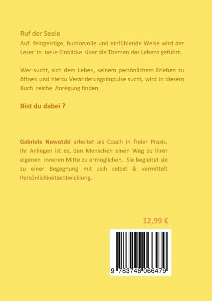 Ruf der SeeleAuf feingeistige, humorvolle und einfühlende Weise wird der Leser in eine ergänzende Wahrnehmung über die Themen des Lebens geführt. Wer sucht sich dem Leben, seinem persönlichem Erleben, zu öffnen und hierzu Veränderungsimpulse sucht, wird in diesem Buch reiche Anregung finden. Bist du dabei?