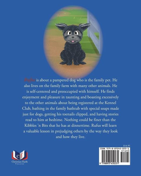 Rufus is about a pampered dog who is the family pet. He also lives on the family farm with many other animals. He is self-centered and preoccupied with himself. He finds enjoyment and pleasure in taunting and boasting excessively to the other animals about being registered at the Kennel Club, bathing in the family bathtub with special soaps made just for dogs, getting his toenails clipped, and having stories read to him at bedtime. Nothing could be finer than the Kibbles 'n Bits that he has at dinnertime. Rufus will learn a valuable lesson in prejudging others by the way they look and how they live.