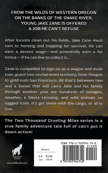 From the wilds of western Oregon on the banks of the Snake River, young Jake Zane is offered a job he can't refuse. After locusts clean out his fields, Jake Zane must turn to hunting and trapping for survival. He can earn a decent wage-and potentially earn a fat bonus-if he can live to collect it... Zane is compelled to sign on as a wagon and mule train guard into unchartered territory, from Oregon to gold rush San Francisco. All that's between him and a bonus that will carry Jake and his family through another year are hundreds of savages, weather, a Sierra crossing, and wild animals on rugged trails. It's get there with the cargo, or all is lost. The Two Thousand Grueling Miles series is a true family adventure tale full of can't put it down action.