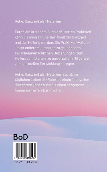 Ruhe. Ganzheit als MysteriumDurch die in diesem Buch erläuterten Praktiken kann die innere Ruhe zum Quell der Ganzheit und der Heilung werden. Die Praktiken wollen - unter anderem - Impulse zu gelingenden zwischenmenschlichen Beziehungen, zum Heilen, zum Dienen, zu universellem Mitgefühl, zur spirituellen Entwicklung anregen.Ruhe. Ganzheit als Mysterium sucht, im täglichen Leben die Ruhe als einen liebevollen "Gefährten", aber auch als einen bergenden Innenraum erfahrbar machen.