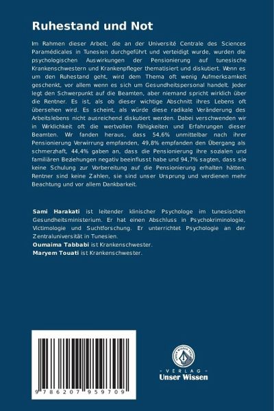 Im Rahmen dieser Arbeit, die an der Université Centrale des Sciences Paramédicales in Tunesien durchgeführt und verteidigt wurde, wurden die psychologischen Auswirkungen der Pensionierung auf tunesische Krankenschwestern und Krankenpfleger thematisiert und diskutiert. Wenn es um den Ruhestand geht, wird dem Thema oft wenig Aufmerksamkeit geschenkt, vor allem wenn es sich um Gesundheitspersonal handelt. Jeder legt den Schwerpunkt auf die Beamten, aber niemand spricht wirklich über die Rentner. Es ist, als ob dieser wichtige Abschnitt ihres Lebens oft übersehen wird. Es scheint, als würde diese radikale Veränderung des Arbeitslebens nicht ausreichend diskutiert werden. Dabei verschwenden wir in Wirklichkeit oft die wertvollen Fähigkeiten und Erfahrungen dieser Beamten. Wir fanden heraus, dass 54,6% unmittelbar nach ihrer Pensionierung Verwirrung empfanden, 49,8% empfanden den Übergang als schmerzhaft, 44,4% gaben an, dass die Pensionierung ihre sozialen und familiären Beziehungen negativ beeinflusst habe und 94,7% sagten, dass sie keine Schulung zur Vorbereitung auf die Pensionierung erhalten hätten. Rentner sind keine Zahlen, sie sind unser Ursprung und verdienen mehr Beachtung und vor allem Dankbarkeit.