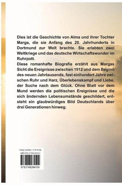 Dies ist die Geschichte von Alma und ihrer Tochter Marga, die sie Anfang des 20. Jahrhunderts in Dortmund zur Welt brachte. Sie erlebten zwei Weltkriege und das deutsche Wirtschaftswunder im Ruhrpott. Diese romanhafte Biografie erzählt aus Margas Sicht die Ereignisse zwischen 1912 und dem Beginn des neuen Jahrtausends, fast einhundert Jahre zwischen Ruhr und Harz, Überlebenskampf und Liebe, der Suche nach dem Glück. Ohne Blatt vor dem Mund werden die politischen Ereignisse und die sich ändernden Lebensumstände geschildert, entsteht ein glaubwürdiges Bild Deutschlands über drei Generationen hinweg.