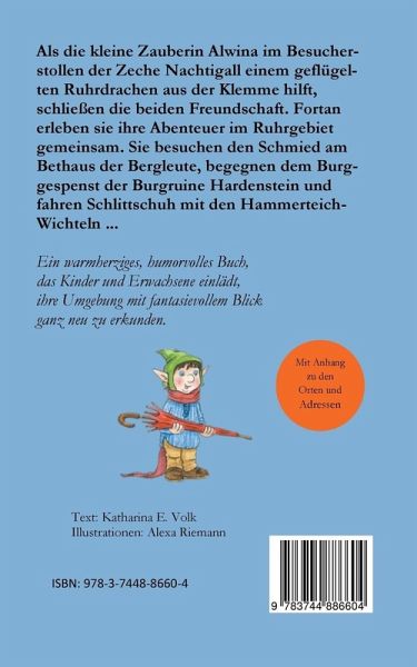 Als die kleine Zauberin Alwina im Besucherstollen der Zeche Nachtigall einem geflügelten Ruhrdrachen aus der Klemme hilft, schließen die beiden Freundschaft. Fortan erleben sie ihre Abenteuer im Ruhrgebiet gemeinsam. Sie besuchen den Schmied am Bethaus der Bergleute, begegnen dem Burggespenst der Burgruine Hardenstein und fahren Schlittschuh mit den Hammerteich-Wichteln ...Ein warmherziges, humorvolles Buch, das Kinder und Erwachsene einlädt, ihre Umgebung mit fantasievollem Blick ganz neu zu erkunden.Mit Anhang zu den Orten und Adressen!