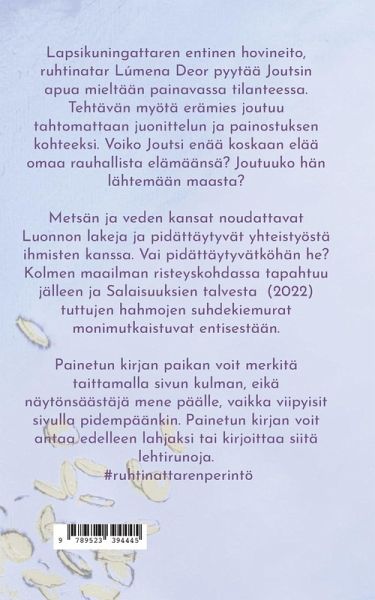 Lapsikuningattaren entinen hovineito, ruhtinatar Lúmena Deor pyytää Joutsin apua mieltään painavassa tilanteessa. Tehtävän myötä erämies joutuu tahtomattaan juonittelun ja painostuksen kohteeksi. Voiko Joutsi enää koskaan elää omaa rauhallista elämäänsä? Joutuuko hän lähtemään maasta? Metsän ja veden kansat noudattavat Luonnon lakeja ja pidättäytyvät yhteistyöstä ihmisten kanssa. Vai pidättäytyvätköhän he? Kolmen maailman risteyskohdassa tapahtuu jälleen ja Salaisuuksien talvesta (2022) tuttujen hahmojen suhdekiemurat monimutkaistuvat entisestään. Painetun kirjan paikan voit merkitä taittamalla sivun kulman, eikä näytönsäästäjä mene päälle, vaikka viipyisit sivulla pidempäänkin. Painetun kirjan voit antaa edelleen lahjaksi tai kirjoittaa siitä lehtirunoja. #ruhtinattarenperintö