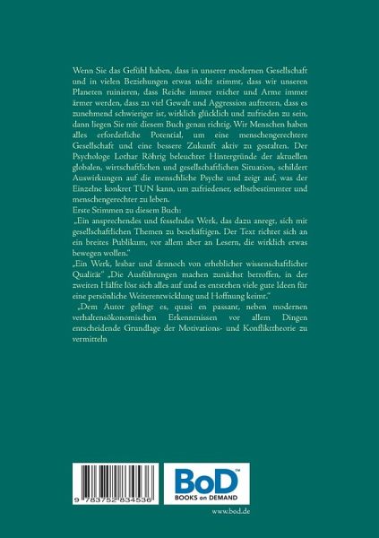 Wenn Sie das Gefühl haben, dass in unserer modernen Gesellschaft und in vielen Beziehungen etwas nicht stimmt, dass wir unseren Planeten ruinieren, dass Reiche immer reicher und Arme immer ärmer werden, dass zu viel Gewalt und Aggression auftreten, dass es zunehmend schwieriger ist, wirklich glücklich und zufrieden zu sein, dann liegen Sie mit diesem Buch genau richtig. Wir Menschen haben alles erforderliche Potential, um eine menschengerechtere Gesellschaft und eine bessere Zukunft aktiv zu gestalten. Der Psychologe Lothar Röhrig beleuchtet Hintergründe der aktuellen globalen, wirtschaftlichen und gesellschaftlichen Situation, schildert Auswirkungen auf die menschliche Psyche und zeigt auf, was der Einzelne konkret TUN kann, um zufriedener, selbstbestimmter und menschengerechter zu leben.