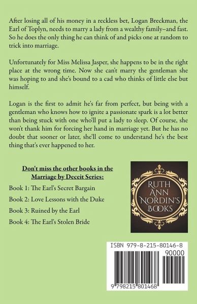 After losing all of his money in a reckless bet, Logan Breckman, the Earl of Toplyn, needs to marry a lady from a wealthy family–and fast. So he does the only thing he can think of and picks one at random to trick into marriage. Unfortunately for Miss Melissa Jasper, she happens to be in the right place at the wrong time. Before she knows it, he comes up to her carriage and kisses her…and she is doomed. Now she can't marry the gentleman she was hoping to and she's bound to a cad who thinks of little else but himself. Logan is the first to admit he's far from perfect, but being with a gentleman who knows how to ignite a passionate spark is a lot better than being stuck with one who'll put a lady to sleep. Of course, she won't thank him for forcing her hand in marriage yet. But he has no doubt that sooner or later, she'll come to understand he's the best thing that's ever happened to her.