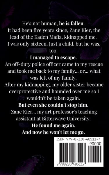 HE FOUND HER ONCE, HE CAN DO IT AGAIN He's not human, he is fallen. It had been five years since, Zane Kier, the lead of the Kaden Mafia, kidnapped me. I was only sixteen. Just a child, but he was, too. I managed to escape. An off-duty police officer came to my rescue and took me back to my family... or... what was left of my family. After my kidnapping, my older sister became overprotective and hounded over me so I wouldn't be taken again. But even she couldn't stop him. Zane Kier... my art professor's teaching assistant at Bitterwave University. He found me again. And now he won't let me go.