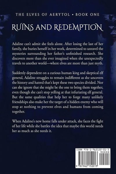 Stranded in a strange, new world, can she trust her protector will help her find home? Adaline can't admit she feels alone. After losing the last of her family, she buries herself in her research, determined to unravel the mysteries surrounding her father's unfinished work. But she discovers more than she ever imagined when she unexpectedly travels to another world-where elves are more than just myth. Suddenly dependent on a curious human king and skeptical elf general, Adaline struggles to remain indifferent as she uncovers the history and hatred that's kept these two species divided. Nor can she ignore that she might be the one to bring them together-even though she can't stop yelling at that infuriating elf general. Unfortunately, the same qualities that help her to forge many unlikely friendships also make her the target of a hidden enemy who will stop at nothing to prevent elves and humans from coming together. When Adaline's new home falls under attack, she faces the fight of her life while she battles the idea that maybe this world needs her as much as she needs it. Ruins and Redemption is ideal for readers looking for a strong female lead, grumpy vs sunshine, fae and elves, and waiting evil. This slow-burn story sets the stage for an epic fantasy with spicy romance that guarantees an HEA. Don't miss out on this breathtaking combination of fantasy, adventure, and romance.