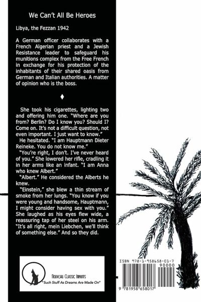 A dramatic saga with a noir bent set in the Sahara Desert WW2 North Africa -- Libya, Cairo, Algeria, Tunisia. We Can't All Be Heroes Libya, the Fezzan 1942 A German officer collaborates with a French Algerian priest and a Jewish Resistance leader to safeguard his munitions complex from the Free French in exchange for his protection of the inhabitants of their shared oasis from German and Italian authorities. A matter of opinion who is the boss. She took his cigarettes, lighting two and offering him one. "Where are you from? Berlin? Do I know you? Should I? Come on. It's not a difficult question, not even important. I just want to know." He hesitated. "I am Hauptmann Dieter Reineke. You do not know me." "You're right, I don't. I've never heard of you." She lowered her rifle, cradling it in her arms like an infant. "I am Anna who knew Albert." "Albert." He considered the Alberts he knew. "Einstein," she blew a thin stream of smoke from her lungs. "You know if you were young and handsome, Hauptmann, I might consider having sex with you." She laughed as his eyes flew wide, a reassuring tap of her steel on his arm. "It's all right, mein Liebchen, we'll think of something else." And so they did.