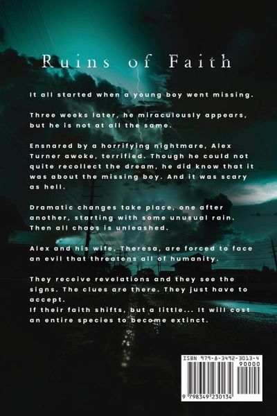 It all started when a young boy went missing. Three weeks later he miraculously appears, but he is not at all the same. Ensnared by a horrifying nightmare Alex Turner awoke terrified. Though he could not quite recollect the dream he did know that it was about the missing boy. And it was scary as hell. Dramatic changes take place, one after another, starting with some unusual rain. Then all chaos is unleashed. Alex and his wife Theresa are forced to face an evil that threatens all of humanity. They receive revelations and they see the signs. The clues are there. They just have to accept. If their faith shifts, but a little... It will cost an entire species to become extinct.