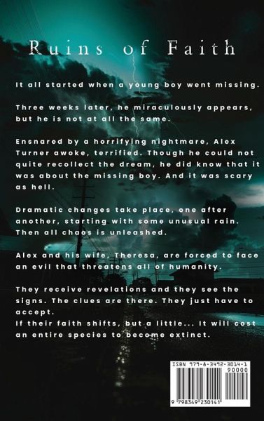 It all started when a young boy went missing. Three weeks later he miraculously appears, but he is not at all the same. Ensnared by a horrifying nightmare Alex Turner awoke terrified. Though he could not quite recollect the dream he did know that it was about the missing boy. And it was scary as hell. Dramatic changes take place, one after another, starting with some unusual rain. Then all chaos is unleashed. Alex and his wife Theresa are forced to face an evil that threatens all of humanity. They receive revelations and they see the signs. The clues are there. They just have to accept. If their faith shifts, but a little... It will cost an entire species to become extinct.