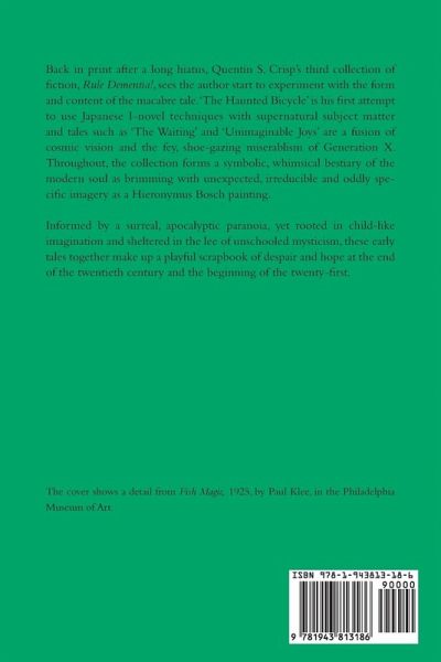 Back in print after a long hiatus, Quentin S. Crisp’s third collection of fiction, Rule Dementia!, sees the author start to experiment with the form and content of the macabre tale. ‘The Haunted Bicycle’ is his first attempt to use Japanese I-novel techniques with supernatural subject matter and tales such as ‘The Waiting’ and ‘Unimaginable Joys’ are a fusion of cosmic vision and the fey, shoe-gazing miserablism of Generation X. Throughout, the collection forms a symbolic, whimsical bestiary of the modern soul as brimming with unexpected, irreducible and oddly specific imagery as a Hieronymus Bosch painting. Informed by a surreal, apocalyptic paranoia, yet rooted in child-like imagination and sheltered in the lee of unschooled mysticism, these early tales together make up a playful scrapbook of despair and hope at the end of the twentieth century and the beginning of the twenty-first.