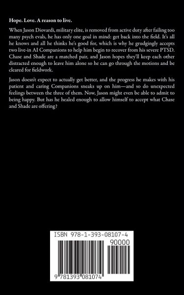 Hope. Love. A reason to live. When Jason Diovardi, military elite, is removed from active duty after failing too many psych evals, he has only one goal in mind: get back into the field. It's all he knows and all he thinks he's good for, which is why he grudgingly accepts two live-in AI Companions to help him begin to recover from his severe PTSD. Chase and Shade are a matched pair, and Jason hopes they'll keep each other distracted enough to leave him alone so he can go through the motions and be cleared for fieldwork. Jason doesn't expect to actually get better, and the progress he makes with his patient and caring Companions sneaks up on him-and so do unexpected feelings between the three of them. Now, Jason might even be able to admit to being happy. But has he healed enough to allow himself to accept what Chase and Shade are offering?
