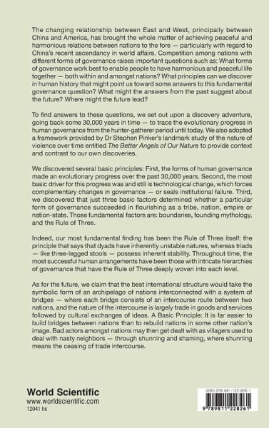 The changing relationship between East and West, principally between China and America, has brought the whole matter of achieving peaceful and harmonious relations between nations to the fore - particularly with regard to China's recent ascendancy in world affairs. Competition among nations with different forms of governance raises important questions such as: What forms of governance work best to enable people to have harmonious and peaceful life together - both within and amongst nations? What principles can we discover in human history that might point us toward some answers to this fundamental governance question? What might the answers from the past suggest about the future? Where might the future lead? To find answers to these questions, we set out upon a discovery adventure, going back some 30,000 years in time - to trace the evolutionary progress in human governance from the hunter-gatherer period until today. We also adopted a framework provided by Dr Stephen Pinker's landmark study of the nature of violence over time entitled The Better Angels of Our Nature to provide context and contrast to our own discoveries. We discovered several basic principles: First, the forms of human governance made an evolutionary progress over the past 30,000 years. Second, the most basic driver for this progress was and still is technological change, which forces complementary changes in governance - or seals institutional failure. Third, we discovered that just three basic factors determined whether a particular form of governance succeeded in flourishing as a tribe, nation, empire or nation-state. Those fundamental factors are: boundaries, founding mythology, and the Rule of Three. Indeed, our most fundamental finding has been the Rule of Three itself: the principle that says that dyads have inherently unstable natures, whereas triads - like three-legged stools - possess inherent stability. Throughout time, the most successful human arrangements have been those with intricate hierarchies of governance that have the Rule of Three deeply woven into each level. As for the future, we claim that the best international structure would take the symbolic form of an archipelago of nations interconnected with a system of bridges - where each bridge consists of an intercourse route between two nations, and the nature of the intercourse is largely trade in goods and services followed by cultural exchanges of ideas. A Basic Principle: It is far easier to build bridges between nations than to rebuild nations in some other nation's image. Bad actors amongst nations may then get dealt with as villagers used to deal with nasty neighbors - through shunning and shaming, where shunning means the ceasing of trade intercourse.