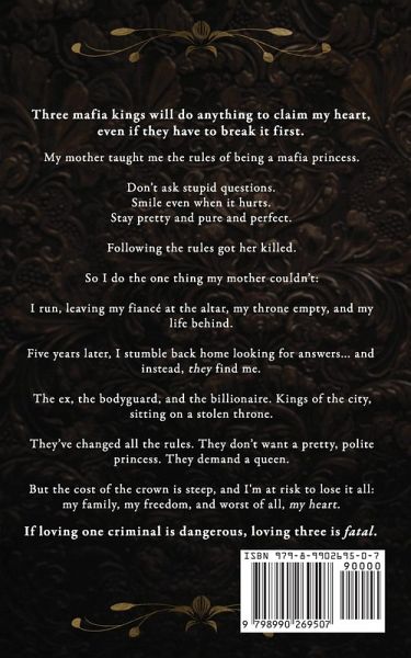 Three mafia kings will do anything to claim my heart, even if they have to break it first. My mother taught me the rules of being a mafia princess. Don't ask stupid questions. Smile even when it hurts. Stay pretty and pure and perfect. Following the rules got her killed. So I do the one thing my mother couldn't: I run, leaving my fiancé at the altar, my throne empty, and my life behind. Five years later, I stumble back home looking for answers... and instead, they find me. The ex, the bodyguard, and the billionaire. Kings of the city, sitting on a stolen throne. They've changed all the rules. They don't want a pretty, polite princess. They demand a queen. But the cost of the crown is steep, and I'm at risk to lose it all: my family, my freedom, and worst of all, my heart. If loving one criminal is dangerous, loving three is fatal. Rule of Three is book one of a dark Russian mafia why choose romance duet, with a cliffhanger ending. The men are morally gray, tattooed, possessive, and powerful. Check TWs on my website.