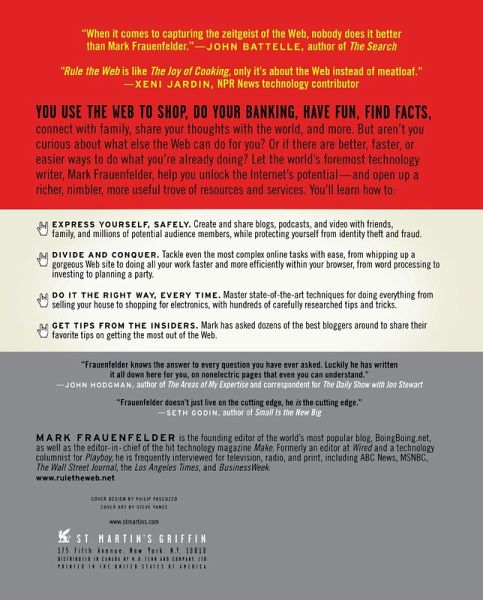 In Rule the Web, you'll learn how to: * Browse recklessly, free from viruses, ads, and spyware * Turn your browser into a secure and powerful anywhere office * Raze your old home page and build a modern Web masterpiece * Get the news so fast it'll leave skidmarks on your inbox * Fire your broker and let the Internet make you rich * Claim your fifteen megabytes of fame with a blog or podcast You use the Web to shop, do your banking, have fun, find facts, connect with family, share your thoughts with the world, and more. But aren't you curious about what else the Web can do for you? Or if there are better, faster, or easier ways to do what you're already doing? Let the world's foremost technology writer, Mark Frauenfelder, help you unlock the Internet's potential-and open up a richer, nimbler, and more useful trove of resources and services, including: EXPRESS YOURSELF, SAFELY. Create and share blogs, podcasts, and online video with friends, family, and millions of potential audience members, while protecting yourself from identity theft and fraud. DIVIDE AND CONQUER. Tackle even the most complex online tasks with ease, from whipping up a gorgeous Web site to doing all your work faster and more efficiently within your browser, from word processing to investing to planning a party. THE RIGHT WAY, EVERY TIME. Master state-of-the-art techniques for doing everything from selling your house to shopping for electronics, with hundreds of carefully researched tips and tricks. TIPS FROM THE INSIDERS. Mark has asked dozens of the best bloggers around to share their favorite tips on getting the most out of the Web.