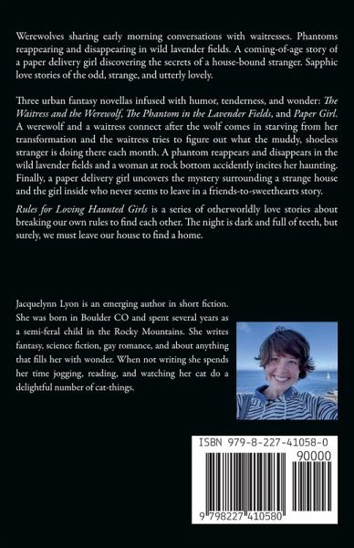 There's a beast in the woods. There's a ghost in the fields. There's something wrong with the house down the lane. They'll tell you: turn away from unnatural women for surely the wolf will eat you whole and the phantom will haunt you till the ends of the earth. However, love is made of more things in heaven and earth than dreamt of in your fables. Three Sapphic novellas infused with humor, tenderness, and wonder: The Waitress and the Werewolf, The Phantom in the Lavender Fields, and Paper Girl. A werewolf shares early morning conversations with a waitress after she comes in starving from her transformation and the waitress tries to figure out what the muddy, shoeless stranger is doing there each month. A phantom reappears and disappears in the wild lavender fields and a woman at rock bottom accidently incites her haunting. Finally, a coming-of-age story of a paper delivery girl as she uncovers the mystery surrounding a strange house and the girl inside who never seems to leave. Rules for Loving Haunted Girls is a series of otherworldly love stories about rewriting conventions through finding each other. The night is dark and full of teeth, but surely, we must leave our house to find a home.