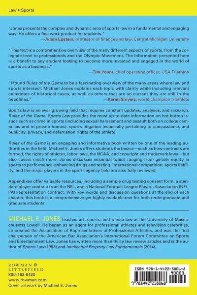 Sports law is an ever-growing field that requires constant updates, analyses, and research. Rules of the Game: Sports Law provides the most up-to-date information on hot-button issues such as crime in sports-including sexual harassment and assault both on college campuses and in private homes-sports litigation-especially pertaining to concussions-and publicity, privacy, and defamation rights of the athlete in today's social media-crazed world where reputations can be destroyed in an instant. Rules of the Game is an engaging and informative book written by one of the leading authorities in the field. Michael E. Jones offers readers the basics-such as how contracts are formed, the rights of athletes, labor laws, the NCAA, and copyright and trademark laws-but also covers much more. Jones discusses such essential topics as gender equity in sports, performance enhancing drugs and testing, international competition, and sports liability. The growth of multi-million and even billion dollar sports franchises requires enhanced professionalism in the area of negotiating sports and endorsement contracts, and the major players in the sports agency field are covered in full. Rules of the Game contains appendixes that offer valuable resources, including a sample drug testing consent form, a standard player contract from the NFL, and a National Football League Players Association (NFLPA) representation contract. With key words and discussion questions at the end of each chapter, this book is a comprehensive yet highly readable text for both undergraduate and graduate students.