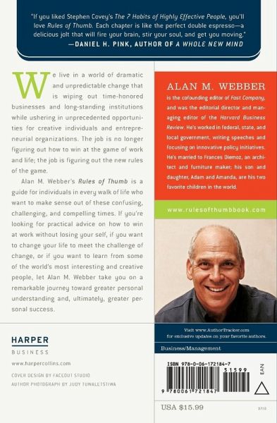 We live in a world of dramatic and unpredictable change that is wiping out time-honored businesses and long-standing institutions while ushering in unprecedented opportunities for creative individuals and entrepreneurial organizations. The job is no longer figuring out how to win at the game of work and life; the job is figuring out the new rules of the game. Alan M. Webber's Rules of Thumb is a guide for individuals in every walk of life who want to make sense out of these confusing, challenging, and compelling times. If you're looking for practical advice on how to win at work without losing your self, if you want to change your life to meet the challenge of change, or if you want to learn from some of the world's most interesting and creative people, let Alan M. Webber take you on a remarkable journey toward greater personal understanding and, ultimately, greater personal success.
