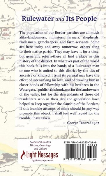 Originally published in 1907, this book describes the Valley of the Rule River in the Borders region of Scotland and the lives of the people who lived there during the 18th and 19th centuries in picturesque yet objective terms. Rulewater and its People is an unusual resource for those wanting to know about life in rural Scotland including the villages and estates like Bedrule, Spittal-on-Rule, Abbotrule, Hobkirk, Bonchester, Hallrule, Bullerwell, Town O' Rule. Hawthornside, Harwood, Stonedge, Wauchope. The author's extensive family tree records make this work a valuable reference for many seeking information about the geneology of their families including those named Turnbull, Oliver, Scott, Armstrong, Eliott, Minto, Rutherfurd, Rutherford, Young, Kerr, St. Clair, Sinclair, Usher, Laidla, Laidlaw, and others. In 1907 the author said "The population of our Border parishes are all much alike-landowners, ministers, farmers, shepherds, tradesmen, gamekeepers, and farm-servants. Some are here today and away tomorrow; others cling to their native parish. They may leave it for a time, but generally return-these all find a place in this history of the district. In whatever part of the world this book falls into the hands of a Rulewater man or one who is united to this district by the ties of ancestry or kindred, I trust its perusal may have the effect of intensifying his love, and of drawing him in closer bonds of fellowship with his brethren in the Watergate. I publish this book, not for the landowners of the valley, but for the descendants of those old residenters who in their day and generation have helped to keep together the clanship of the Borders. If this humble attempt of mine should in any way promote this object, I shall feel well repaid for the trouble I have taken."
