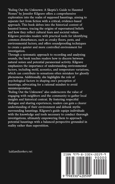 "Ruling Out the Unknown: A Skeptic's Guide to Haunted Homes" by Jennifer Kilgrave offers a comprehensive exploration into the realm of supposed hauntings, aiming to separate fact from fiction with a critical, evidence-based approach. This book delves into the historical context of haunted homes, tracing the origins of supernatural beliefs and how they reflect cultural fears and societal values. Kilgrave provides readers with practical tools for identifying common disturbances, such as creaky floors, pests, and environmental factors, and offers soundproofing techniques to create a quieter and more controlled environment for investigation. Through a systematic approach to recording and analyzing sounds, the book teaches readers how to discern between natural noises and potential paranormal activity. Kilgrave emphasizes the importance of understanding environmental factors, including mold, acoustics, and temperature variations, which can contribute to sensations often mistaken for ghostly phenomena. Additionally, she highlights the role of psychological factors in shaping one's perception of hauntings, advocating for a rational mindset to avoid misinterpretation. "Ruling Out the Unknown" also underscores the value of engaging with neighbors and the community to gather local insights and historical context. By fostering respectful dialogue and sharing experiences, readers can gain a clearer understanding of their environment and debunk myths surrounding hauntings. Kilgrave's guide equips individuals with the knowledge and tools necessary to conduct thorough investigations, ultimately empowering them to approach potential hauntings with a balanced perspective grounded in reality rather than superstition.