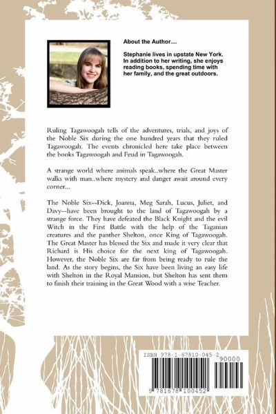 Ruling Tagawoogah tells of the adventures, trials, and joys of the Noble Six during the one hundred years that they ruled Tagawoogah. The events chronicled here take place between the books Tagawoogah and Feud in Tagawoogah. A strange world where animals speak..where the Great Master walks with man..where mystery and danger await around every corner... The Noble Six--Dick, Joanna, Meg Sarah, Lucus, Juliet, and Davy--have been brought to the land of Tagawoogah by a strange force. They have defeated the Black Knight and the evil Witch in the First Battle with the help of the Taganian creatures and the panther Shelton, once King of Tagawoogah. The Great Master has blessed the Six and made it very clear that Richard is His choice for the next king of Tagawoogah. However, the Noble Six are far from being ready to rule the land. As the story begins, the Six have been living an easy life with Shelton in the Royal Mansion, but Shelton has sent them to finish their training in the Great Wood with a wise Teacher.