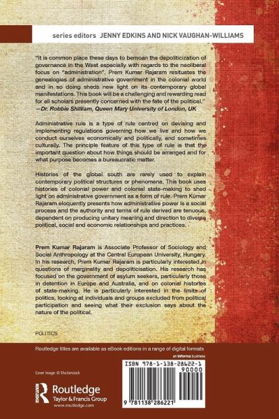 Administrative rule is a type of rule centered on devising and implementing regulations governing how we live and how we conduct ourselves economically and politically, and sometimes culturally. The principle feature of this type of rule is the important question about how things should be arranged and for what purpose becomes a bureaucratic matter. Histories of the global south are rarely used to explain contemporary political structures or phenomena. This book uses histories of colonial power and colonial state-making to shed light on administrative government as a form of rule. Prem Kumar Rajaram eloquently presents how administrative power is a social process and the authority and terms of rule derived are tenuous, dependent on producing unitary meaning and direction to diverse political, social and economic relationships and practices.