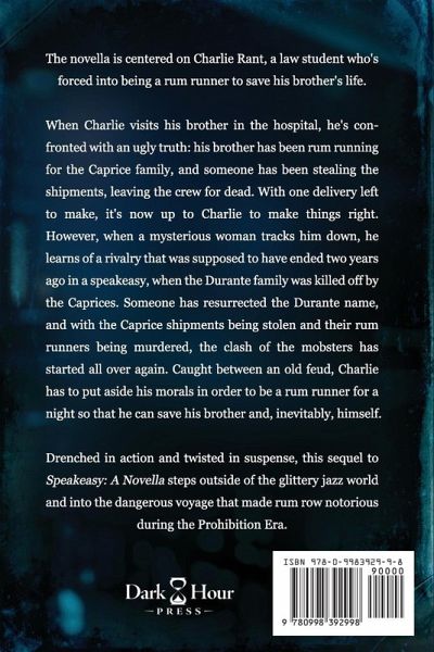 The novella is centered on Charlie Rant, a law student who's forced into being a rum runner to save his brother's life. When Charlie visits his brother in the hospital, he's confronted with an ugly truth: his brother has been rum running for the Caprice family, and someone has been stealing the shipments, leaving the crew for dead. With one delivery left to make, it's now up to Charlie to make things right. However, when a mysterious woman tracks him down, he learns of a rivalry that was supposed to have ended two years ago in a speakeasy, when the Durante family was killed off by the Caprices. Someone has resurrected the Durante name, and with the Caprice shipments being stolen and their rum runners being murdered, the clash of the mobsters has started all over again. Caught between an old feud, Charlie has to put aside his morals in order to be a rum runner for a night so that he can save his brother and, inevitably, himself. Drenched in action and twisted in suspense, this sequel to Speakeasy: A Novella steps outside of the glittery jazz world and into the dangerous voyage that made rum row notorious during the Prohibition Era.