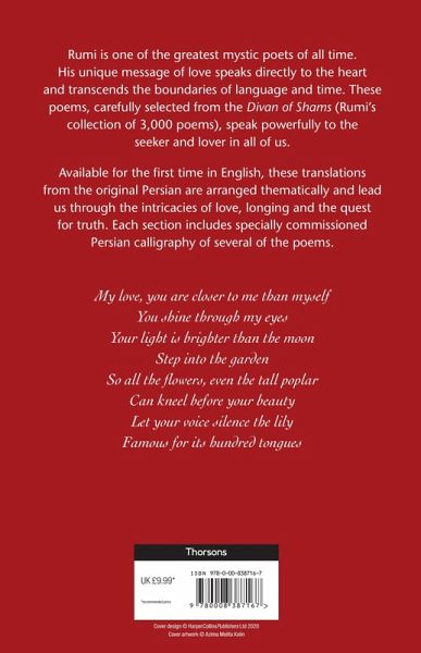 A breathtaking new collection of translations of poems by Rumi, one of the worldâ s most loved mystical teachers and bestselling poets. Beautifully packaged and illustrated with paintings and Persian calligraphy, this is an ideal gift.