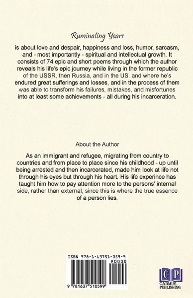 "Ruminating Years" is about my life's journey through which I reveal my personal life experience in a poetic way. It consists of 74 short and epic poems that talk about love, despair, happiness and loss, humor, sarcasm, and spiritual and intellectual growth while being incarcerated since the year 2000. But mostly the book reveals the important of being true to oneself, understanding that life is a path on which we attain our spiritual and intellectual growth; and if we do not share our life experience with the rest of the world, then our internal growth will die with us; and our lives will serve no purpose to the ones in need of guidance and we will be forgotten just as swiftly as the clouds pass over us.