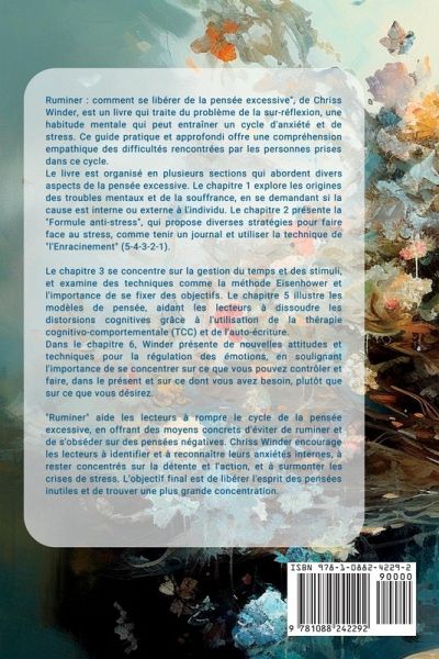 Ruminer : comment se libérer de la pensée excessive", de Chriss Winder, est un livre qui traite du problème de la sur-réflexion, une habitude mentale qui peut entraîner un cycle d'anxiété et de stress. Ce guide pratique et approfondi offre une compréhension empathique des difficultés rencontrées par les personnes prises dans ce cycle. Le livre est organisé en plusieurs sections qui abordent divers aspects de la pensée excessive. Le chapitre 1 explore les origines des troubles mentaux et de la souffrance, en se demandant si la cause est interne ou externe à l'individu. Le chapitre 2 présente la "Formule anti-stress", qui propose diverses stratégies pour faire face au stress, comme tenir un journal et utiliser la technique de "l'Enracinement" (5-4-3-2-1). Le chapitre 3 se concentre sur la gestion du temps et des stimuli, et examine des techniques comme la méthode Eisenhower et l'importance de se fixer des objectifs. Le chapitre 5 illustre les modèles de pensée, aidant les lecteurs à dissoudre les distorsions cognitives grâce à l'utilisation de la thérapie cognitivo-comportementale (TCC) et de l'auto-écriture. Dans le chapitre 6, Winder présente de nouvelles attitudes et techniques pour la régulation des émotions, en soulignant l'importance de se concentrer sur ce que vous pouvez contrôler et faire, dans le présent et sur ce dont vous avez besoin, plutôt que sur ce que vous désirez. "Ruminer" aide les lecteurs à rompre le cycle de la pensée excessive, en offrant des moyens concrets d'éviter de ruminer et de s'obséder sur des pensées négatives. Chriss Winder encourage les lecteurs à identifier et à reconnaître leurs anxiétés internes, à rester concentrés sur la détente et l'action, et à surmonter les crises de stress. L'objectif final est de libérer l'esprit des pensées inutiles et de trouver une plus grande concentration.