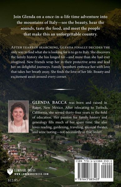 Join Glenda on a once-in-a-life time adventure into the mountains of Italy-see the beauty, hear the sounds, taste the food, and meet the people that make this an unforgettable country. After years of searching, Glenda finally decides the only way to find what she is looking for is to go to Italy. She discovers the family history she has longed for-and more than she had ever imagined. New friends wrap her in their protective arms and lead her on delightful journeys. Family members embrace her with love that takes her breath away. She finds the love of her life. Beauty and excitement await around every corner.