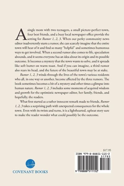A single mom with two teenagers, a small picture-perfect town, four best friends, and a busy local newspaper office provide the setting for Rumor 1, 2, 3. When our perky community news editor inadvertently starts a rumor, she can scarcely imagine that the entire town will hear of it and find so many "helpful" and sometimes humorous ways to get involved. When a second rumor also comes to life, speculation abounds, and it seems everyone has an idea about its origin and its possible outcome. It becomes a mystery that the town wants to solve, and it spreads like soft butter on warm toast. And if you can imagine, a third rumor also rears its head, and the future of the beautiful town may be at stake. Rumor 1, 2, 3 winds through the lives of the town's various residents who all, in one way or another, become affected by the three rumors. The book sometimes becomes a bit of a mystery and other times a glimpse into human nature. Rumor 1, 2, 3 includes some moments of acquired wisdom and growth for the optimistic newspaper editor, her family, friends, and hopefully, the readers. What first started as a rather innocent remark made to friends, Rumor 1, 2, 3 takes a surprising path with unexpected consequences for the whole town. Even with its twists and turns, it is a lighthearted, upbeat story sure to make the reader wonder what could possibly be the outcome.