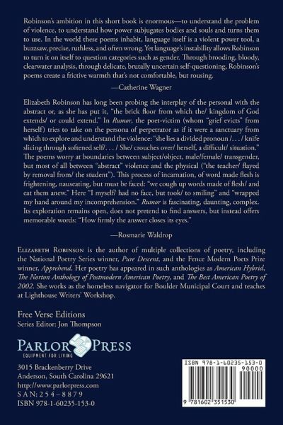 Robinson's ambition in Rumor is enormous-to understand the problem of violence, to understand how power subjugates bodies and souls and turns them to use. In the world these poems inhabit, language itself is a violent power tool, a buzzsaw, precise, ruthless, and often wrong. Yet language's instability allows Robinson to turn it on itself to question categories such as gender. Through brooding, bloody, clearwater analysis, through delicate, brutally uncertain self-questioning, Robinson's poems create a frictive warmth that's not comfortable, but rousing. -Catherine Wagner Elizabeth Robinson has long been probing the interplay of the personal with the abstract or, as she has put it, "the brick floor from which the/ kingdom of God extends/ or could extend." In Rumor, the poet-victim (whom "grief evicts" from herself) tries to take on the persona of perpetrator as if it were a sanctuary from which to explore and understand the violence: "she lies a divided pronoun /. . . / knife slicing through softened self/. . . / She/ crouches over/ herself, a difficult/ situation." The poems worry at boundaries between subject/object, male/female/ transgender, but most of all between "abstract" violence and the physical ("the teacher/ flayed by removal from/ the student"). This process of incarnation, of word made flesh is frightening, nauseating, but must be faced: "we cough up words made of flesh/ and eat them anew." Here "I myself/ had no face, but took/ to smiling" and "wrapped my hand around my incomprehension." Rumor is fascinating, daunting, complex. Its exploration remains open, does not pretend to find answers, but instead offers memorable words: "How firmly the answer closes its eyes." -Rosmarie Waldrop ELIZABETH ROBINSON is the author of multiple collections of poetry, including the National Poetry Series winner, Pure Descent, and the Fence Modern Poets Prize winner, Apprehend. Her poetry has appeared in such anthologies as American Hybrid, The Norton Anthology of Postmodern American Poetry, and The Best American Poetry of 2002. She works as the homeless navigator for Boulder Municipal Court and teaches at Lighthouse Writers' Workshop.