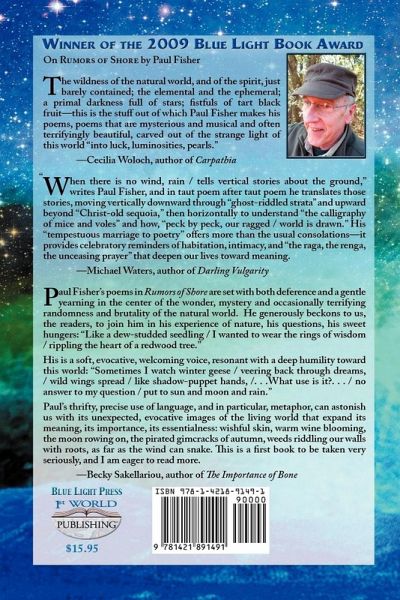 The wildness of the natural world, and of the spirit, just barely contained; the elemental and the ephemeral; a primal darkness full of stars; fistfuls of tart black fruit-this is the stuff out of which Paul Fisher makes his poems, poems that are mysterious and musical and often terrifyingly beautiful, carved out of the strange light of this world "into luck, luminosities, pearls." -Cecilia Woloch, author of Carpathia When there is no wind, rain / tells vertical stories about the ground," writes Paul Fisher, and in taut poem after taut poem he translates those stories, moving vertically downward through "ghost-riddled strata" and upward beyond "Christ-old sequoia," then horizontally to understand "the calligraphy of mice and voles" and how, "peck by peck, our ragged / world is drawn." His "tempestuous marriage to poetry" offers more than the usual consolations-it provides celebratory reminders of habitation, intimacy, and "the raga, the renga, the unceasing prayer" that deepen our lives toward meaning. -Michael Waters, author of Darling Vulgarity Paul Fisher's poems in Rumors of Shore are set with both deference and a gentle yearning in the center of the wonder, mystery and occasionally terrifying randomness and brutality of the natural world. He generously beckons to us, the readers, to join him in his experience of nature, his questions, his sweet hungers: "Like a dew-studded seedling / I wanted to wear the rings of wisdom / rippling the heart of a redwood tree." His is a soft, evocative, welcoming voice, resonant with a deep humility toward this world: "Sometimes I watch winter geese / veering back through dreams, / wild wings spread / like shadow-puppet hands, /. . .What use is it?. . . / no answer to my question / put to sun and moon and rain." Paul's thrifty, precise use of language, and in particular, metaphor, can astonish us with its unexpected, evocative images of the living world that expand its meaning, its importance, its essentialness: wishful skin, warm wine blooming, the moon rowing on, the pirated gimcracks of autumn, weeds riddling our walls with roots, as far as the wind can snake. This is a first book to be taken very seriously, and I am eager to read more. -Becky Sakarelliou, author of The Importance of Bone