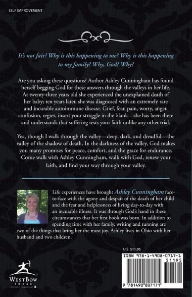 It's not fair! Why is this happening to me? Why is this happening to my family? Why, God? Why? Are you asking these questions? Author Ashley Cunningham has found herself begging God for these answers through the valleys in her life. At twenty-three years old she experienced the unexplained death of her baby; ten years later, she was diagnosed with an extremely rare and incurable autoimmune disease. Grief, fear, pain, worry, anger, confusion, regret, insert your struggle in the blank-she has been there and understands that suffering tests your faith unlike any other trial. Yea, though I walk through the valley-deep, dark, and dreadful-the valley of the shadow of death. In the darkness of the valley, God makes you many promises for peace, comfort, and the grace for endurance. Come walk with Ashley Cunningham, walk with God, renew your faith, and find your way through your valley.