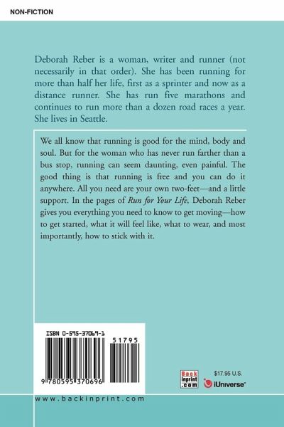 We all know that running is good for the mind, body and soul. But for the woman who has never run farther than a bus stop, running can seem daunting, even painful. The good thing is that running is free and you can do it anywhere. All you need are your own two-feet-and a little support. In the pages of Run for Your Life, Deborah Reber gives you everything you need to know to get moving-how to get started, what it will feel like, what to wear, and most importantly, how to stick with it.