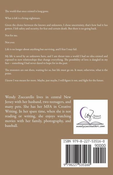 The world that once existed is long gone. What is left is a living nightmare. Given the choice between the known and unknown, I chose uncertainty, that's how bad it has gotten. I left safety and security, for fear and certain death. But there is no going back. Not for me. Not ever. Life is no longer about anything but surviving, and I fear I may fail. My life is saved by an unknown hero, and I am thrust into a world I had no idea existed and exposed to new relationships that change everything. The possibility of love is dangled in my face - something I had never dared to hope for in the past. The monsters are out there, waiting for us, but life must go on. It must, otherwise, what is the point. I know I was meant for more. Maybe, just maybe, I will figure it out, and fight for the future.