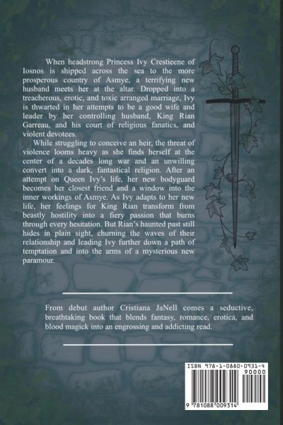 When headstrong Princess Ivy Crestieene of Iosnos is shipped across the sea to the more prosperous country of Asmye, a terrifying new husband meets her at the altar. Dropped into a treacherous, erotic, and toxic arranged marriage, Ivy is thwarted in her attempts to be a good wife and leader by her controlling husband, King Rian Garreau, and his court of religious fanatics, and violent devotees. While struggling to conceive an heir, the threat of violence looms heavy as she finds herself at the center of a decades long war and an unwilling convert into a dark, fantastical religion. After an attempt on Queen Ivy's life, her new bodyguard becomes her closest friend and a window into the inner workings of Asmye. As Ivy adapts to her new life, her feelings for King Rian transform from beastly hostility into a fiery passion that burns through every hesitation. But Rian's haunted past still hides in plain sight, churning the waves of their relationship and leading Ivy further down a path of temptation and into the arms of a mysterious new paramour. From debut author Cristiana JaNell comes a seductive, breathtaking book that blends fantasy, romance, erotica, and blood magick into an engrossing and addicting read.