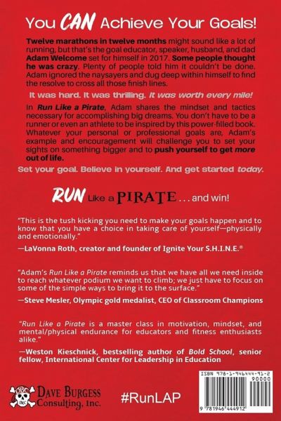 You CAN Achieve Your Goals! Twelve marathons in twelve months might sound like a lot of running, but that’s the goal educator, speaker, husband, and dad Adam Welcome set for himself in 2017. Some people thought he was crazy. Plenty of people told him it couldn’t be done. Adam ignored the naysayers and dug deep within himself to find the resolve to cross all those finish lines. It was hard. It was thrilling. It was worth every mile! In Run Like a Pirate, Adam shares the mindset and tactics necessary for accomplishing big dreams. You don’t have to be a runner or even an athlete to be inspired by this power-filled book. Whatever your personal or professional goals are, Adam’s example and encouragement will challenge you to set your sights on something bigger and to push yourself to get more out of life. Set your goal. Believe in yourself. And get started today. Run Like a Pirate . . . and win! "This is the tush kicking you need to make your goals happen and to know that you have a choice in taking care of yourself—physically and emotionally." —LaVonna Roth, creator and founder of Ignite Your S.H.I.N.E.® "Adam’s Run Like a Pirate reminds us that we have all we need inside to reach whatever podium we want to climb; we just have to focus on some of the simple ways to bring it to the surface." —Steve Mesler, Olympic gold medalist, CEO of Classroom Champions "Run Like a Pirate is a master class in motivation, mindset, and mental/physical endurance for educators and fitness enthusiasts alike." —Weston Kieschnick, bestselling author of Bold School, senior fellow, International Center for Leadership in Education