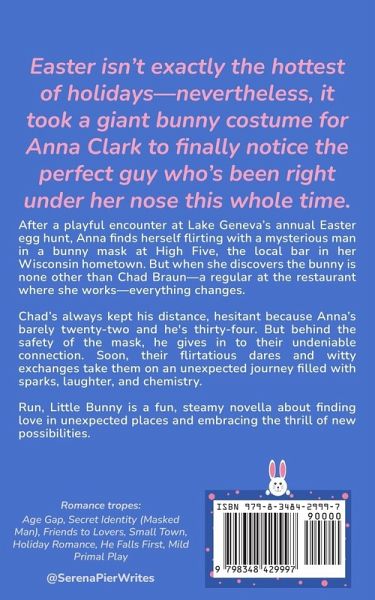 Easter isn't exactly the hottest of holidays-nevertheless, it took a giant bunny costume for Anna Clark to finally notice the perfect guy who's been right under her nose this whole time. After a playful encounter at Lake Geneva's annual Easter egg hunt, Anna finds herself flirting with a mysterious man in a bunny mask at High Five, the local bar in her Wisconsin hometown. But when she discovers the bunny is none other than Chad Braun-a regular at the restaurant where she works-everything changes. Chad's always kept his distance, hesitant because Anna's barely twenty-two and he's thirty-four. But behind the safety of the mask, he gives in to their undeniable connection. Soon, their flirtatious dares and witty exchanges take them on an unexpected journey filled with sparks, laughter, and chemistry. Run, Little Bunny is a fun, steamy novella about finding love in unexpected places and embracing the thrill of new possibilities. (This is Book #4 in the interconnected High Five Novella series. While it's encouraged to read Santa's Coming, Cupid's Shot, and Shamrock Kisses, each book stands alone.) Romance Tropes: Age Gap, Secret Identity (Masked Man), Friends to Lovers, Small Town, Holiday Romance, He Falls First, Mild Primal Play.