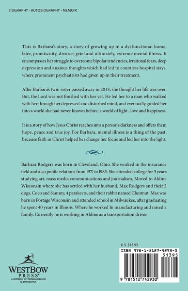 <>This is Barbara's story, a story of growing up in a dysfunctional home, later, promiscuity, divorce, grief and ultimately, extreme mental illness. It encompasses her struggle to overcome bipolar tendencies, irrational fears, deep depression and anxious thoughts which had led to countless hospital stays, where prominent psychiatrists had given up in their treatment. After Barbara's twin sister passed away in 2013, she thought her life was over. But, the Lord was not finished with her yet. He led her to a man who walked with her through her depressed and disturbed mind, and eventually guided her into a world she had never known before, a world of light , love and happiness. It is a story of how Jesus Christ reaches into a person's darkness and offers them hope, peace and true joy. For Barbara, mental illness is a thing of the past, because faith in Christ helped her change her focus and led her into the light.